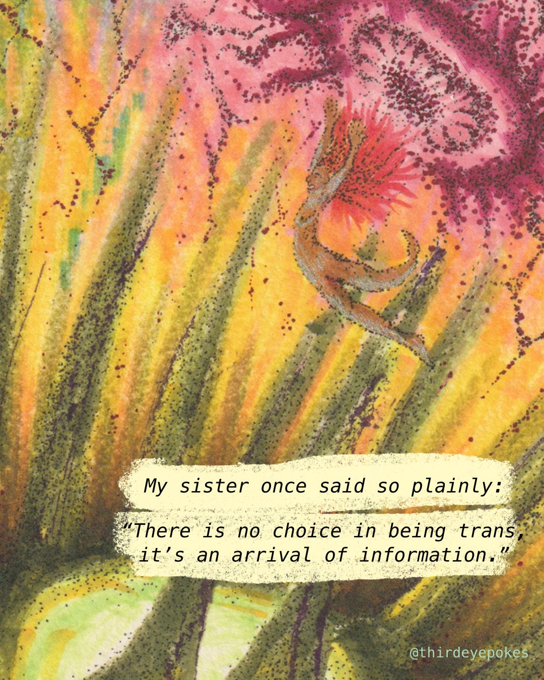 In reflecting on that beautiful quote from your sister, I think about the relationship between the term arrivant and its connection my queer +/trans body as descendent of migrants brought here (as opposed to coming here), and it being a beautiful confrontation asking: now that you have the information, what do you do with it?"